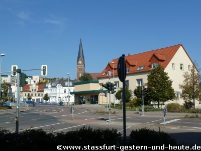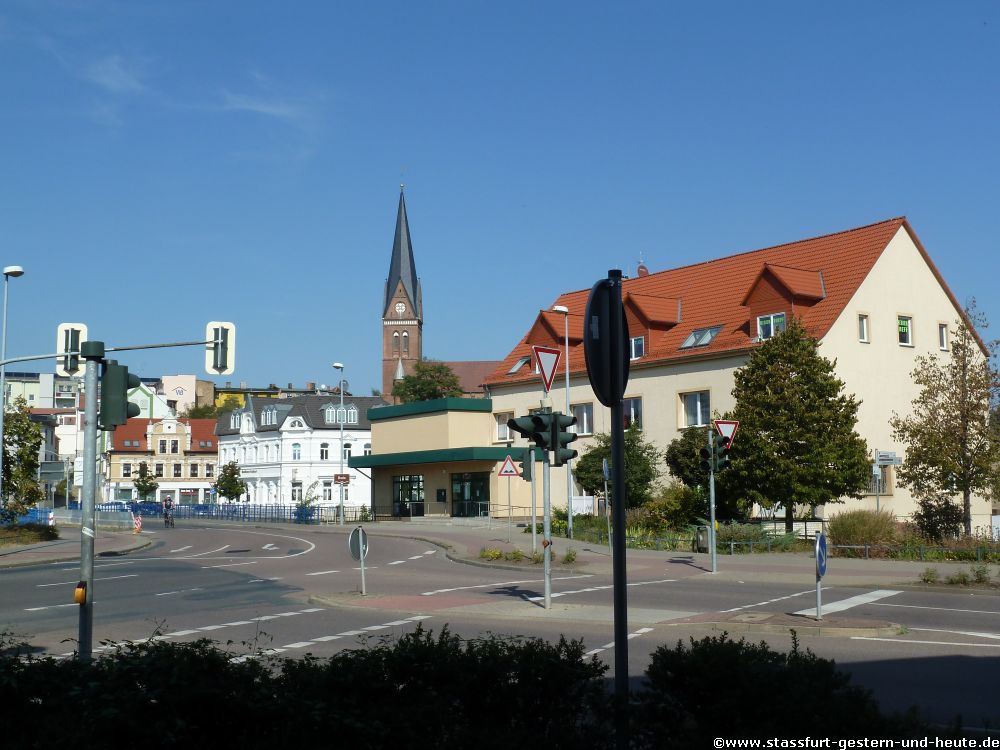 Blick Richtung Alt-Staßfurt. Links noch mit Tankstelle Schuhmann Im Hintergrund links ist gut zu erkennen das es einst 2 Wassertürme gab
